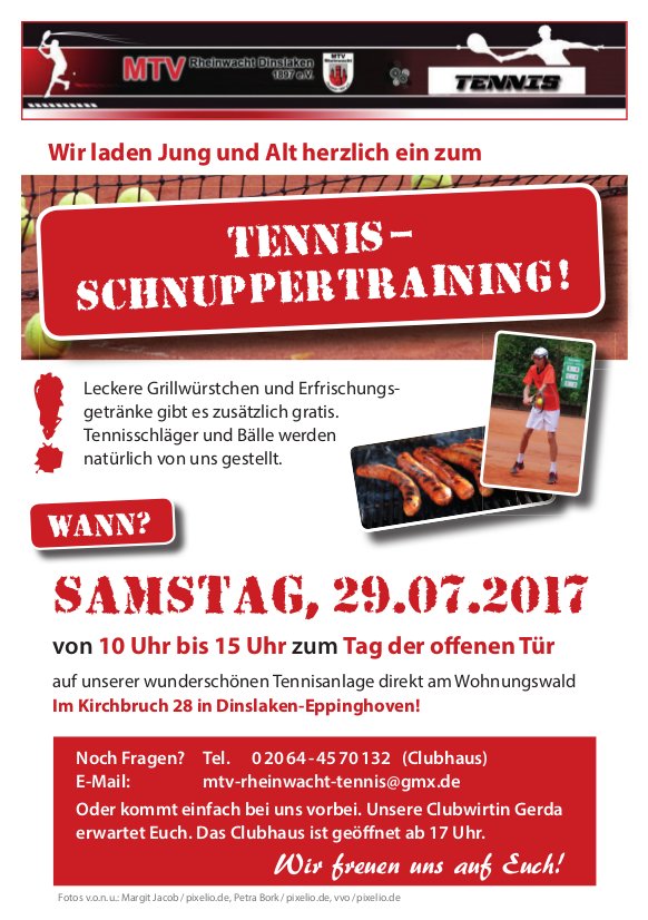An alle Mitglieder des MTV Rheinwacht Dinslaken! Liebe Sportsfreunde, ihr seid schon in einer Abteilung des MTV sportlich tätig. Das ist gut so. Vielleicht möchtet ihr aber zusätzlich auch einmal eine andere Sportart kennenlernen oder sucht einen Freizeitsport für eure Kinder oder Enkel. Tennis ist ein Sport für die ganze Familie und alle Altersstufen.…